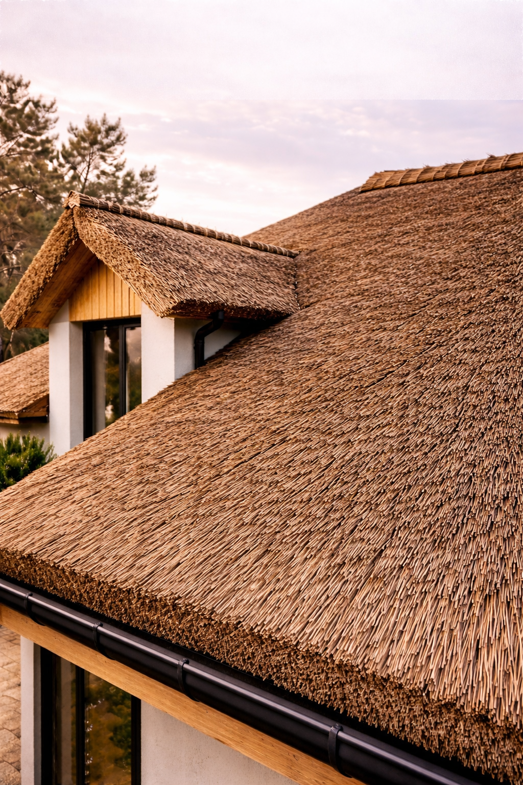 Каждая тростинка уложена вручную, создавая плотный, «дышащий» слой. Такая кровля словно вырастает из ландшафта, органично вписываясь в загородный дом, эко-отель или уютное шале.